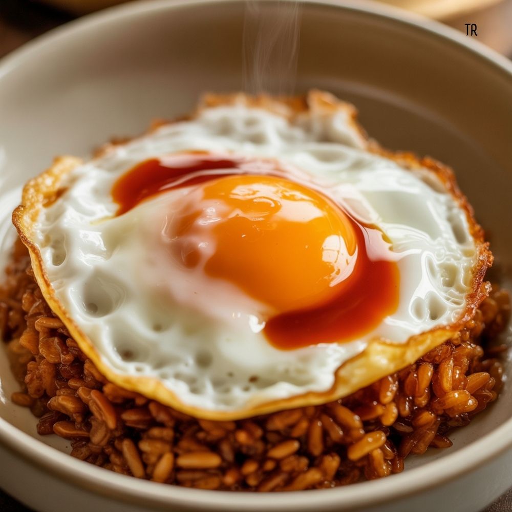 This is a pan-seared chili oil egg over crispy rice with a dark soy glaze, a dish built around contrast. Soft against crisp. Heat against richness. Control against release.